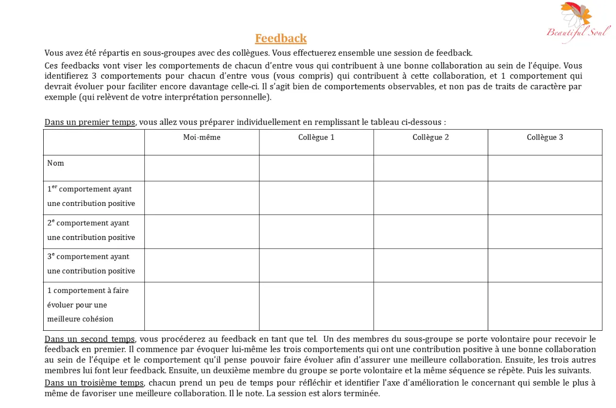 Des centaines d’organisations et des milliers d'individus considèrent que le feedback à la Beautiful Soul est leur exercice préféré. Aujourd'hui, nous avons à cœur de transmettre ce rituel à moindre coût. Notre objectif est d’autonomiser un maximum d’équipes afin qu’elles instaurent durablement une culture de feedback en leur sein.